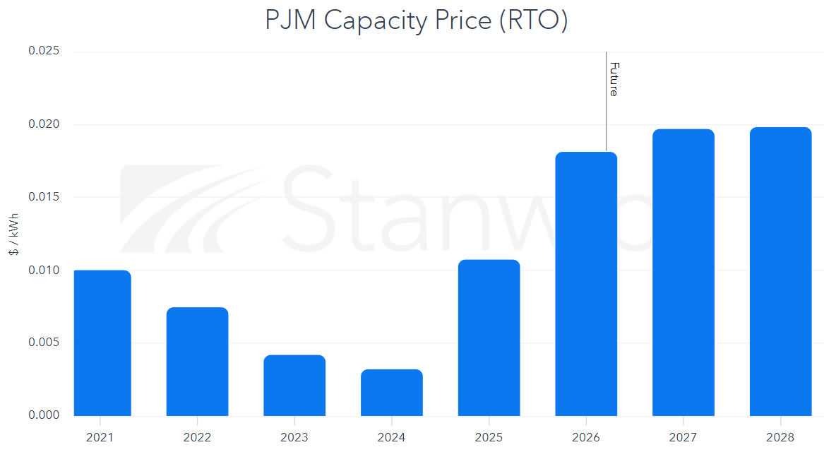 The cost of these capacity commitments ultimately flows through to electricity customers and is embedded within retail supply contracts. For most end users, capacity can represent a meaningful portion of the total electricity supply rate, particularly in the PJM market where recent auction results have increased dramatically.