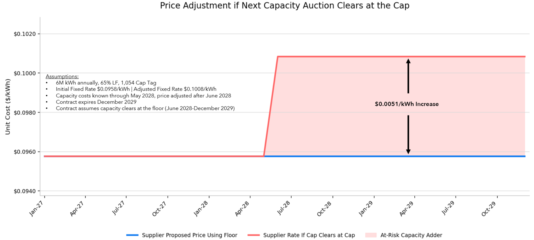 For energy buyers who are unaware of how these assumptions are embedded in supplier pricing, a contract that initially appears competitive may carry more risk than it seems. As shown in the image above, a proposed fixed rate of $0.0958/kWh could ultimately rise to an effective rate of $0.1008/kWh once the supplier adjusts for the actual capacity cost in the previously unknown period.