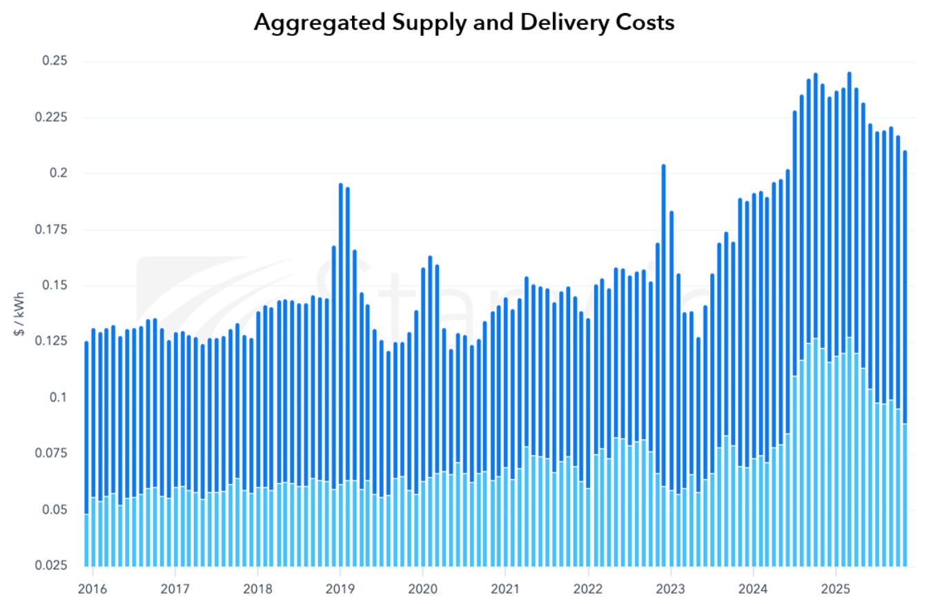 One of the clearest changes is the rise in overall cost. After years in which energy prices were often flat or even declining, that trend reversed. A combination of slower growth in natural gas production, rising LNG exports, growing electricity demand from AI and data centers, broader electrification, and supply chain disruption has put sustained pressure on prices.